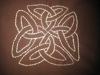 My dad's birthday is in early May and I knew I wouldn't finish the quilt in time. So, I made him a few throw pillows. Two are embroidered with Celtic-style symbols and two are made from home decor fabric. All of the covers slip off. (I'm getting better at making pillow covers!) I chose the fabrics to match the style of his rec room, which we've been working on updating. My only regret is not using heavier fabrics for the brown pillows. The Kona solid I used wrinkles easily. But it doesn't seem to be a huge issue. The striped fabric has held up really well.